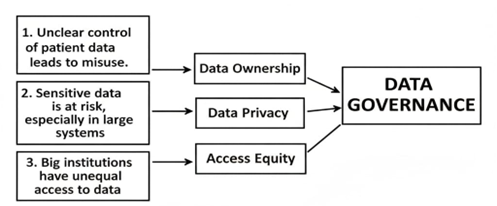 Artificial Intelligence (AI) is increasingly recognized as a vital element in contemporary epidemiology, enhancing the precision of data, operational efficiency and the forecasting of diseases[3]. In the realm of public health surveillance, AI tools, including natural language processing and deep learning, swiftly analyze data from medical records, online platforms and laboratory results to detect initial indicators of outbreaks [7]. Applications of machine learning facilitate the monitoring of disease trends and the prediction of potential risks by charting spatial and temporal patterns. In figure 3 Uncertainties surrounding data ownership and control may result in misuse and privacy threats, especially in extensive healthcare systems. This situation poses a considerable challenge for data governance, given that prominent institutions frequently possess unequal access to information. Consequently, the primary objective is to harmonize strong data privacy with fair access for everyone.