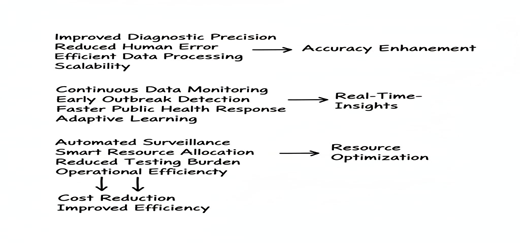 Artificial Intelligence is essential for optimizing resources in public health systems which frequently encounter constraints in funding and staffing. Automated surveillance diminishes the dependence on labor-intensive manual processes, thereby reducing operational expenses and enhancing overall efficiency [40]. AI-driven allocation models assist in directing vaccines, diagnostic kits, and healthcare personnel to populations at high risk, ensuring the greatest impact while reducing waste. In clinical environments, risk-based testing gives priority to individuals who are most likely to be affected, thus avoiding unnecessary procedures and concentrating resources where they are most required. AI facilitates the integration, harmonization and analysis of data, functions that have traditionally demanded significant human effort[24]. These applications conserve time and resources, enabling public health professionals to concentrate on strategic planning and intricate decision-making.