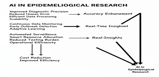 The incorporation of AI into epidemiological research offers considerable benefits across various domains of public health [24]. AI improves diagnostic accuracy, facilitating earlier and more precise disease identification. It enhances surveillance systems with enabling real-time monitoring and swift detection of new outbreaks, which allows for timely public health interventions, with automating routine tasks and optimizing data processing, AI boosts efficiency in both research and healthcare operations[18]. The insights derived from AI promote evidence-based decision-making and a more effective allocation of scarce health resources, these advantages enhance the accuracy, promptness and overall efficacy of epidemiological practices, leading to more agile and informed public health strategies.