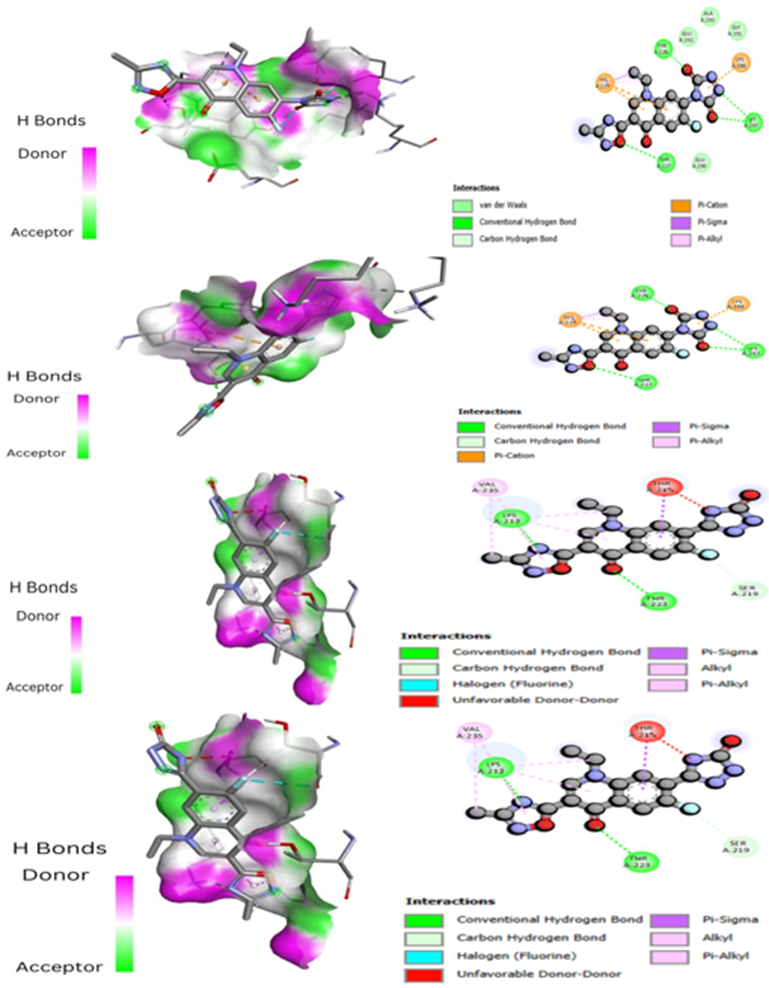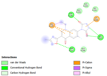 Molecular docking was performed with all ligands, and it was deemed successful since each ligand was positioned within the receptor's active site. The ten molecules with the highest estimated free energy of binding (EFEB) scores were selected for further analysis. These high-scoring molecules' protein-ligand complexes were analyzed for interactions, the docked compound’s orientation, and the active site's interacting residues were observed. The EFEB values of the ten molecules that were chosen ranged from -6.70 to -6.20 (Table 2). The binding cavity's Tyr226, His225, Thr227, Lys188, and Lys297 residues are all substantially interacting with the top-scoring molecule, A1 (Figure 2), (Table 2). Similarly, A2 molecule also have highest EFEB score forms hydrogen bonds with Tyr226, Lys188, Ala293, Lys297, Gly191, His225, and Thr227 (Figure 3, Table 2). Lys213, Thr215, Ser219, and Thr223 are all strongly interacting with the molecule A3. Good patterns of hydrogen bonding and hydrophobic interactions are likewise displayed by all other chosen compounds.