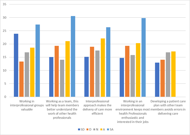 | Working as a team, this will help team members better understand the work of other health professionals | 15.09 | 19.30 | 14.03 | 21.05 | 30.53 |
