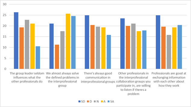| There’s always good communication in interprofessional groups | 24.91 | 20.35 | 19.65 | 19.30 | 15.79 |