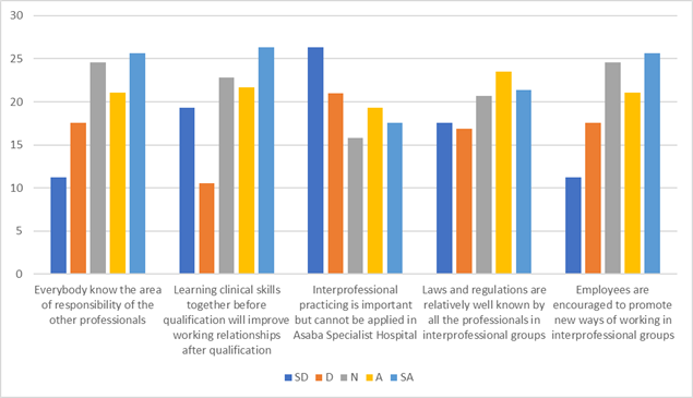 | Interprofessional practicing is important but cannot be applied in Asaba Specialist Hospital. | 26.32 | 21.03 | 15.79 | 19.30 | 17.54 |